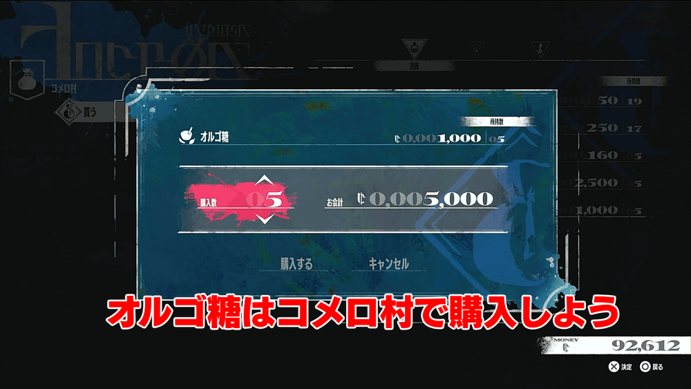 最後の材料である「オルゴ糖」のみ、コメロ村まで行かないと手に入らない。オルゴ糖のためだけに1日費やすのは勿体ないため、依頼「伝書鳩の卵を届けろ」や「遺物を知る人物を探せ」で立ち寄ったついでに購入しておくと効率的だ。