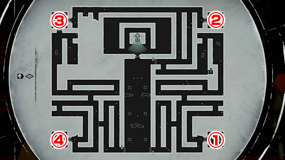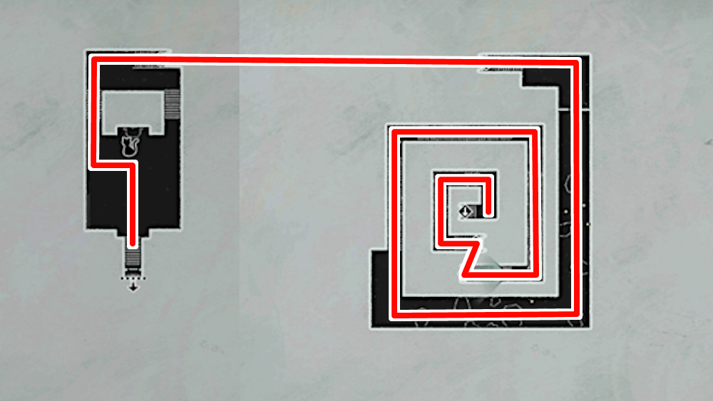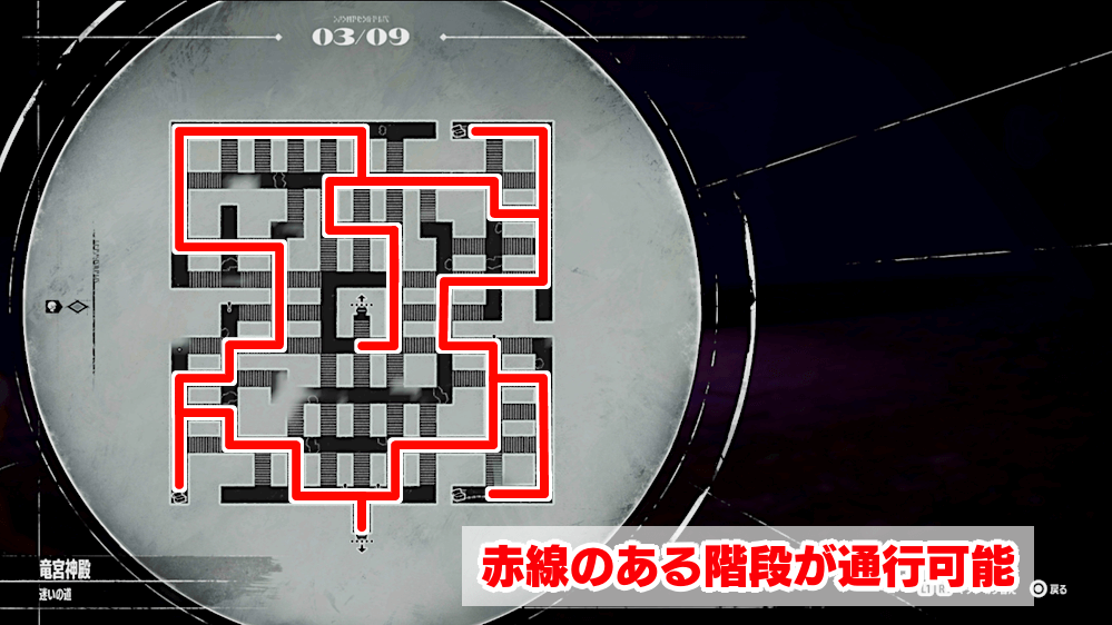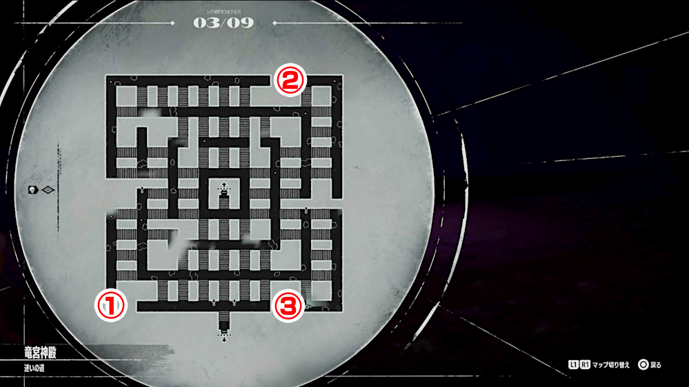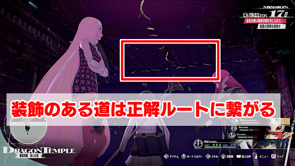 マップ 天井 神殿を道なりに進んでいくと、迷いの道に到着。迷いの道では、霧の濃い場所を進むと元の場所に戻ってしまう。道中のヒントにあるように通路の天井に正しい進路が見えるため、印に従って次のエリアに進もう。