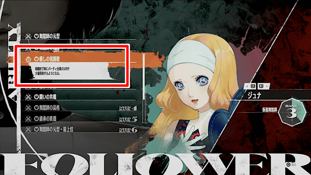 竜宮神殿に挑戦する前に、ジュナの支援者ランクを2まで上げておこう。ジュナのランクを2に上げると、戦闘終了時にパーティ全員のMPが少量回復するようになる。竜宮神殿は他のダンジョンよりも長くMPが枯渇しやすいため、MP回復アビリティ解放後に挑むのがおすすめだ。