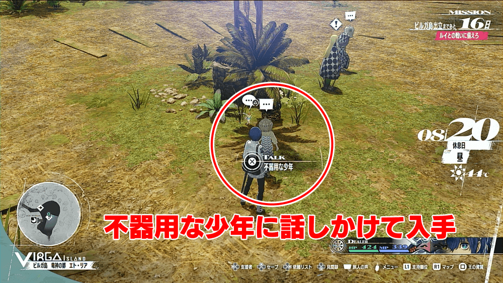 | 8月20日(休) | 解放要素 弔いを阻む蛇食い怪物を倒せをクリアしていれば ・支援者「ジュナ」 竜宮神殿をクリアしていれば ・「ユーファ」がパーティに加入 ・「ガリカ」のランク5 ・依頼「試練に挑むユーファを助けろ」昼 ・自由行動夜 ・自由行動 |