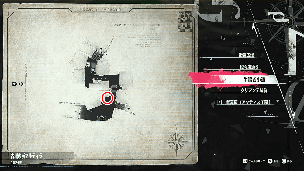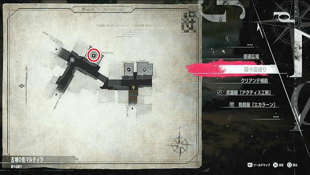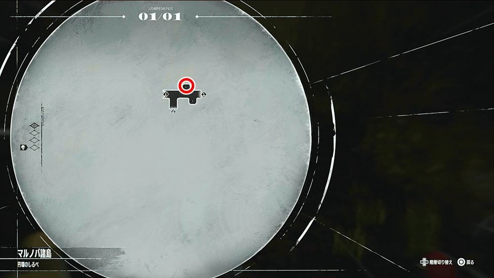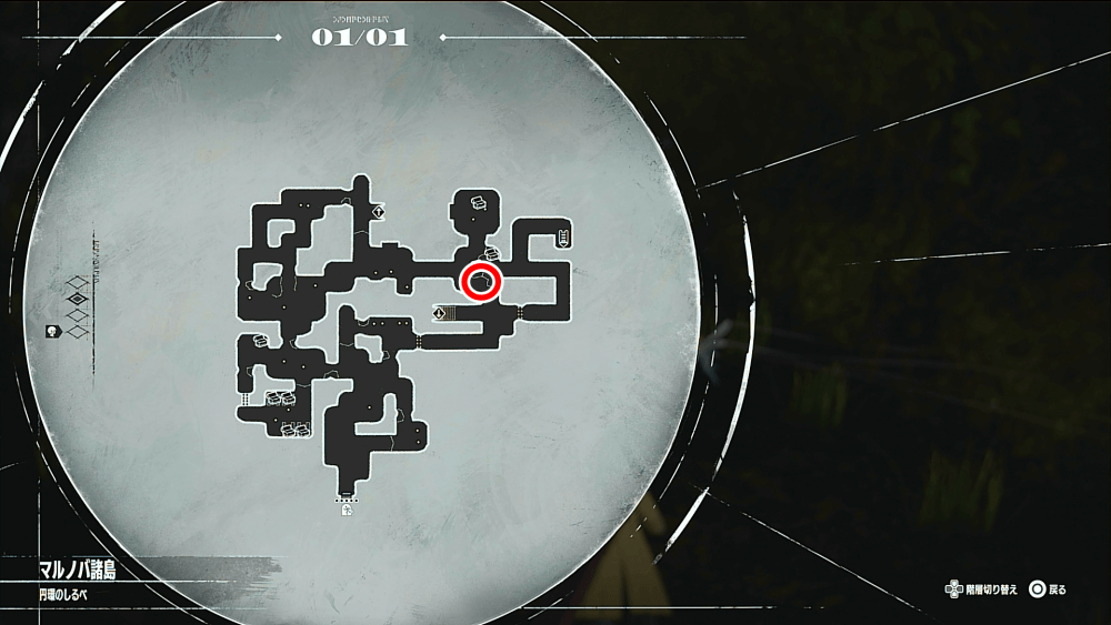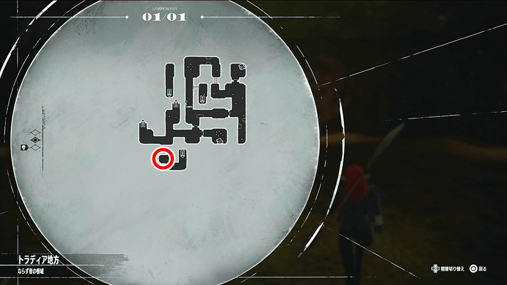 上層1 中層 上層2 辰祝ノ都では草の生えていない道を目印に進み、昇降機で一旦中層に降り、上層南西部へと向かおう。道中には耳の形をしたニンゲンが徘徊しているが、非常に強いうえ倒してもメリットが少ないため、無視して進むのがおすすめ。
