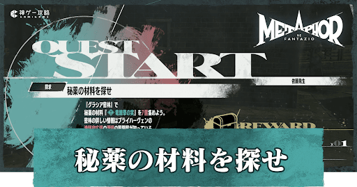 メタファーリファンタジオの依頼「秘薬の材料を探せ」の攻略情報を掲載。受注場所や発生タイミング、報酬などについて掲載しているので、メタファーをプレイする際の参考にどうぞ。