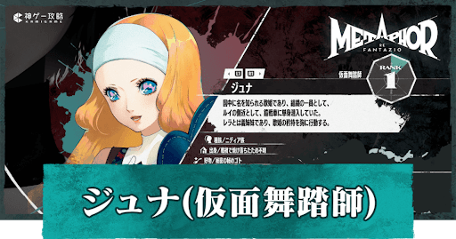 メタファー:リファンタジオのキャラクター「ジュナ(仮面舞踏師)」について解説。ジュナやアーキタイプの性能、好感度上げのおすすめ選択肢とMAG獲得量、支援ランクの効果ついてもまとめ、プロフィールについても掲載。メタファー(アトラス)をプレイする際の参考にどうぞ。