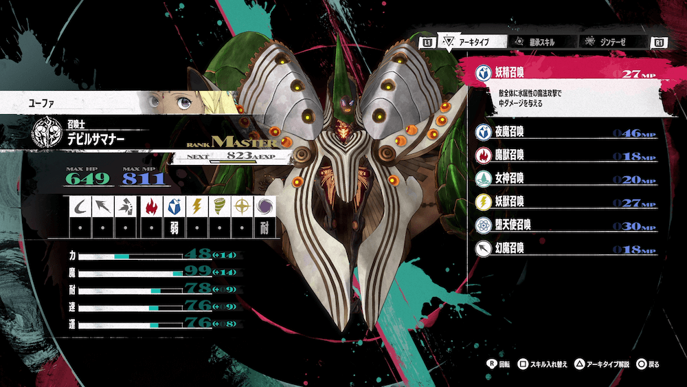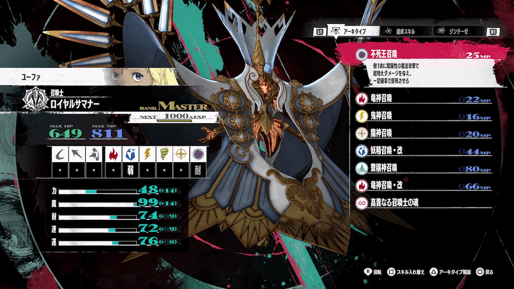アーキタイプの召喚士は主人公専用スキル「格の違い」にで敵の先制を防げるため、不利なバトルが発生しない。また、マスターボーナスではMPに補正があるため、大技を連発しやすくなる。