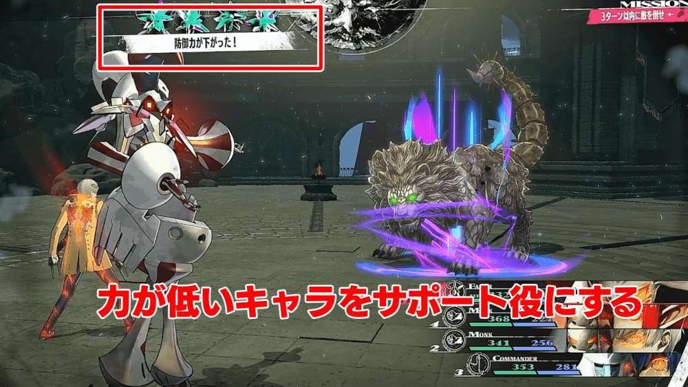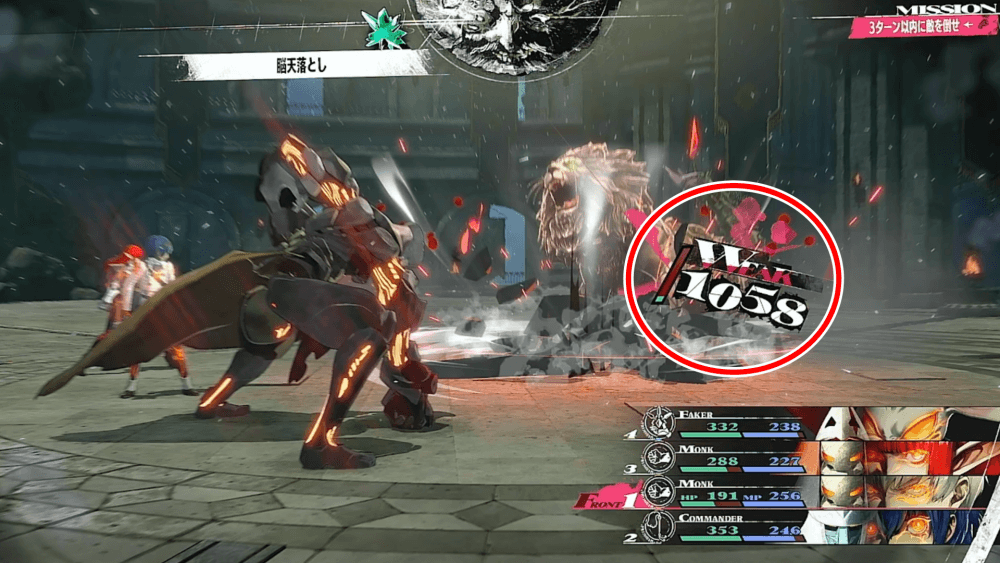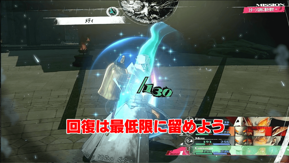 3ターン制限があるので、回復は最低限にして攻撃を優先しよう。育成状況にも左右されるが、モンク2人がかりで攻撃し続ければ2~3ターン目に撃破可能だ。