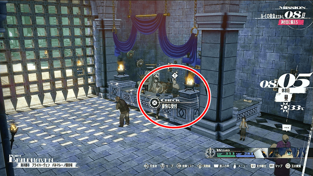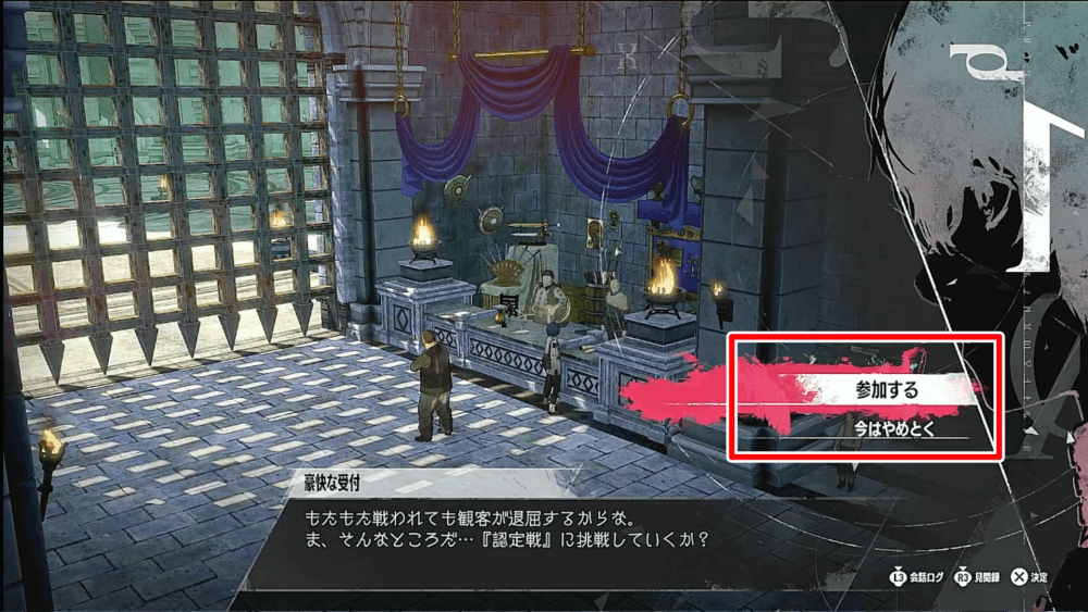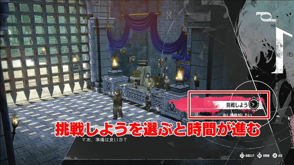 依頼を受注したら、もう一度「豪快な受付」に話しかけよう。「挑戦しよう」を選ぶと時間が進み、そのまま戦闘になるため、受付と話す前に編成や装備は見直しておくと良い。