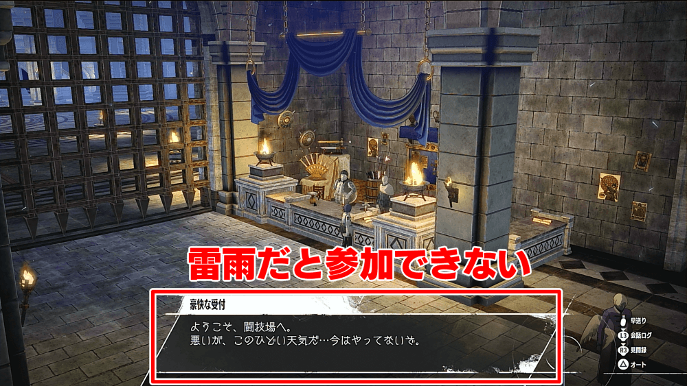 悪天候の日は闘技場が開催されておらず、依頼の受注もできない。参加したい日があるなら、事前に占い師に天気を聞いておくとスムーズに闘技場に挑戦できる。