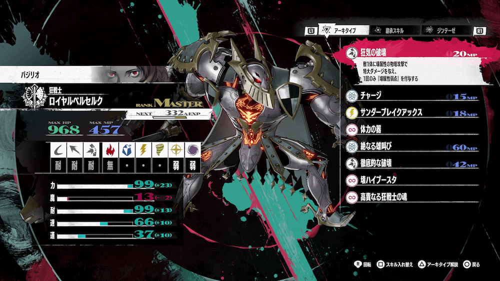 バジリオはストーリー後半での加入になるため、最初からロイヤルを見据えたアーキタイプの育成がおすすめだ。終盤でロイヤルベルセルクを解放するには、狂戦士最上位の「デストロイヤー」ランク20と格闘家最上位の「ケンセイ」ランク20が必要となる。