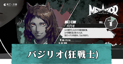 メタファー:リファンタジオのキャラクター「バジリオ(狂戦士)」について解説。バジリオやアーキタイプの性能、好感度上げのおすすめ選択肢とMAG獲得量、支援ランクの効果ついてもまとめ、プロフィールについても掲載。メタファー(アトラス)をプレイする際の参考にどうぞ。