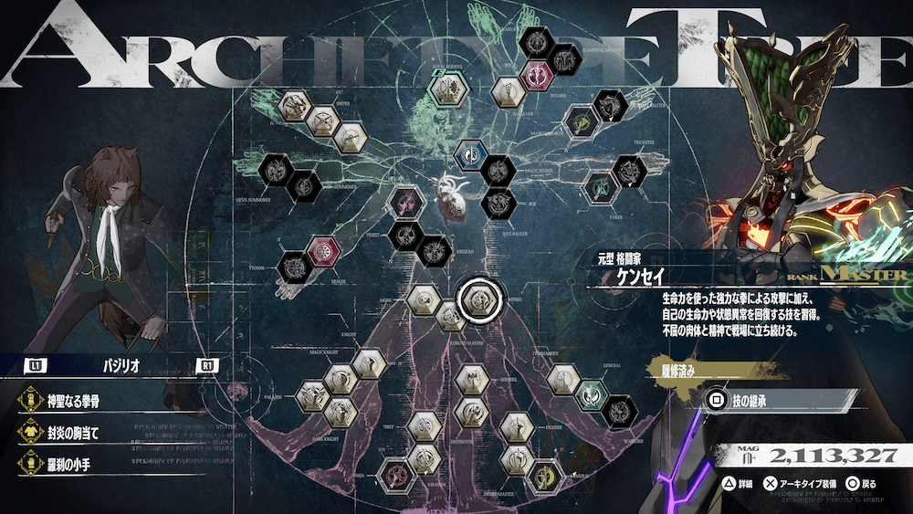 | ランク2 | 狂戦士の風格 「狂戦士」系統アーキタイプの履修MAGを削減できる。獣の嗅覚 バジリオが獣系とニンゲン系モンスターの攻撃を受けた際、回避率が上昇する。 |