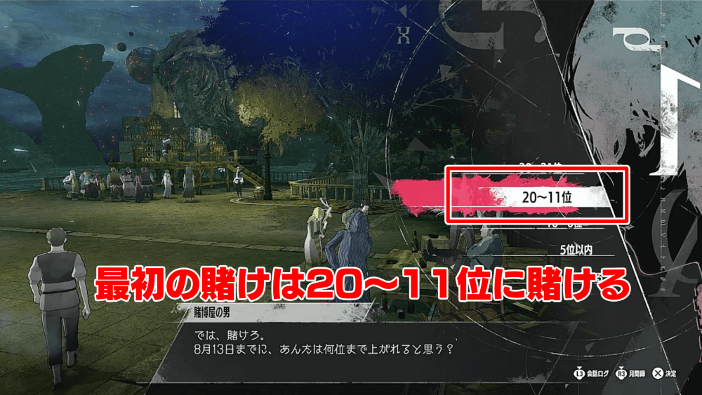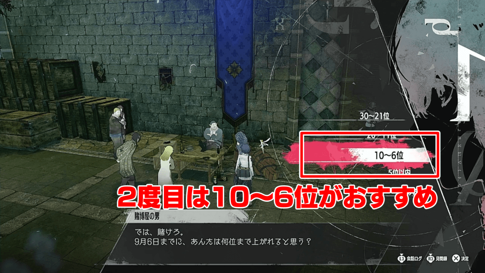 依頼などを全くやらず、一直線でストーリーを進める場合は20~11位に賭けておこう。依頼をこなさない際は、順位が予測しづらくなるため、賭博に参加しないのもアリ。