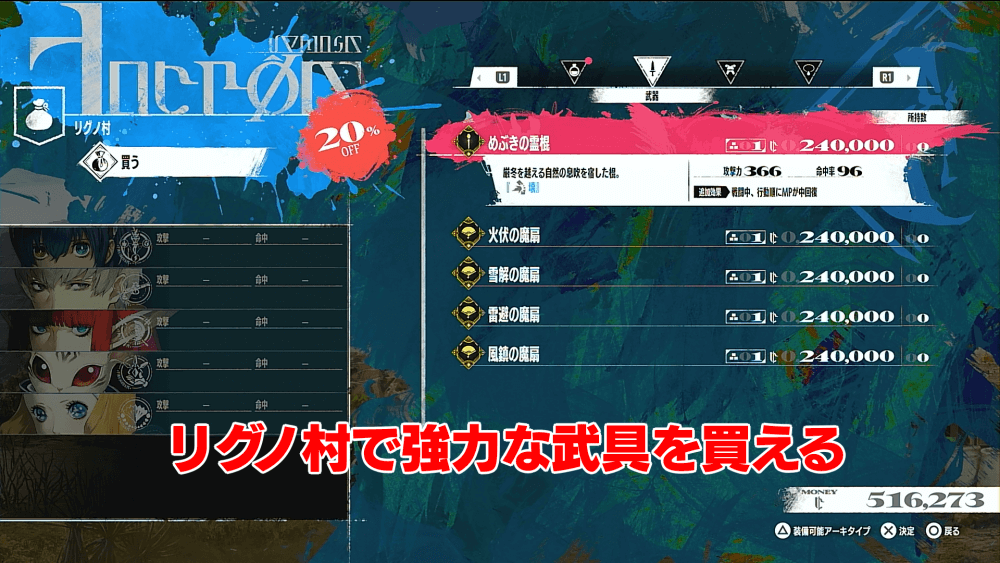 風属性を大幅に見切りやすくなる途中で立ち寄れる「リグノ村」では、高額ながら強力な武具が購入できる。リグノ村の商品も「大安売りの日」の影響を受けるため、セールのタイミングで出発するとお得に買い物可能だ。