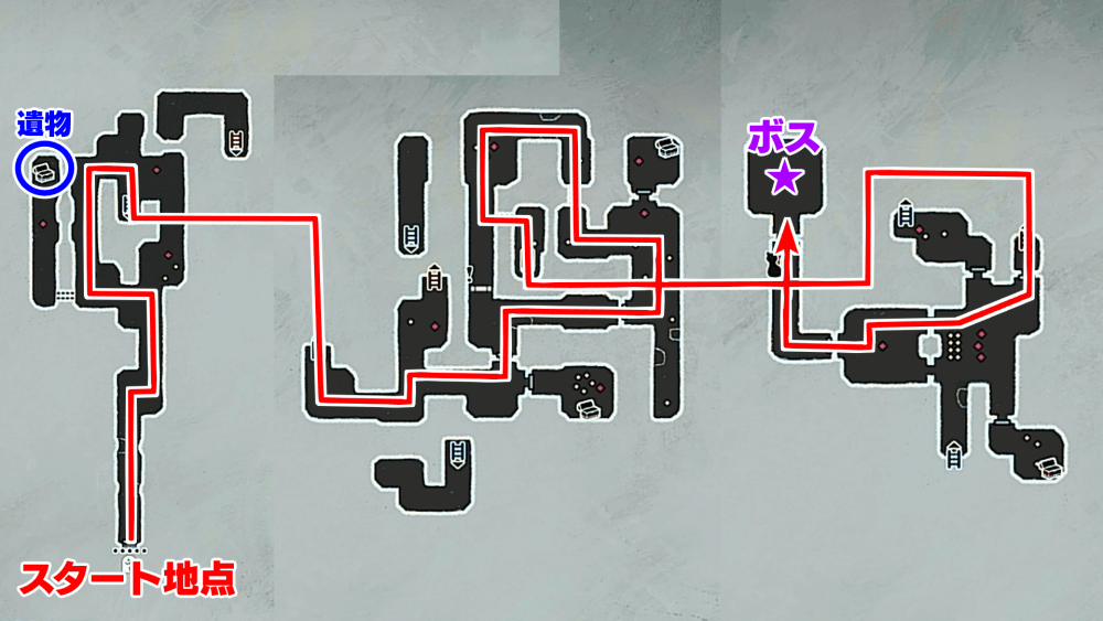 マップ 外観 ダンジョン内の宝箱から、遺物「寄木細工の箱」を回収しよう。遺物はニューラスの依頼「失われた遺物を探せ」の達成に必要だ、途中、しゃがんで穴を通り抜ける場所があるので、ガリカの精霊眼で探すのが良い。
