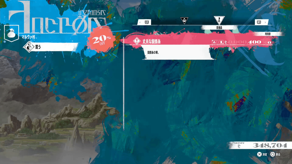 マルヴァ村に到着したら、貴重品の項目にある「丈夫な蜘蛛糸」を購入しよう。消費アイテムのタブから切り替える必要があるので、見落とさないように注意。