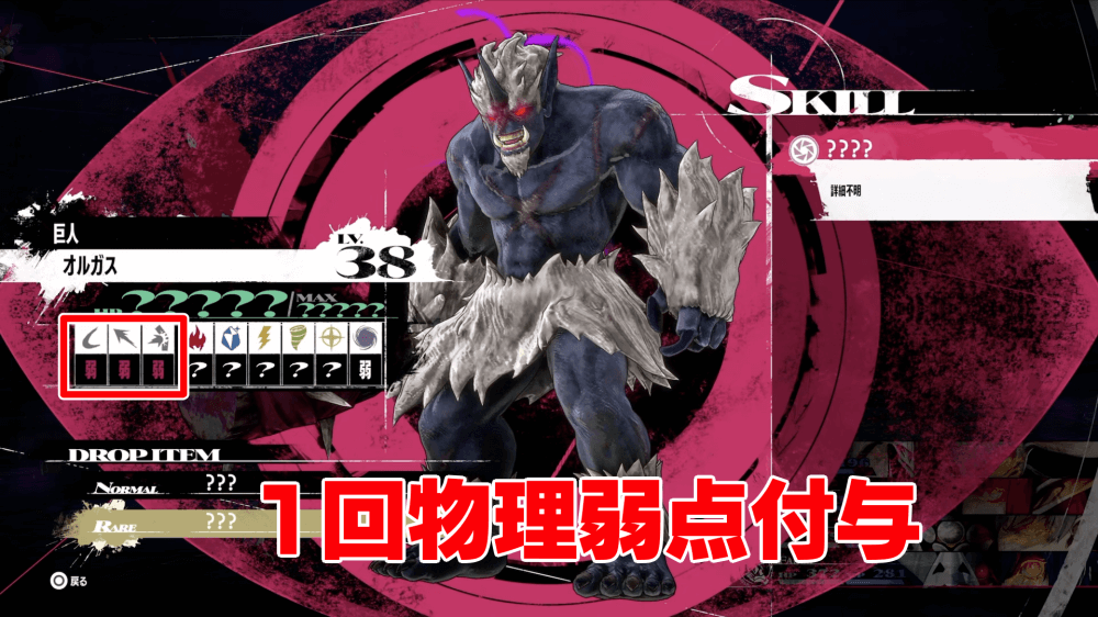 オルガス戦では、ガンナーのジンテーゼ「クレイジーバレット」で物理属性弱点を付与してダメージを与えよう。オルガスは物理属性に耐性があるが、ジンテーゼを発動すると1回まで斬・突・壊属性の通常スキルで弱点攻撃ができる。