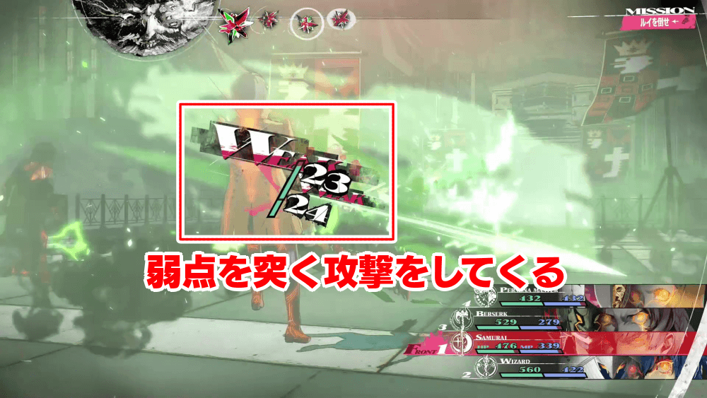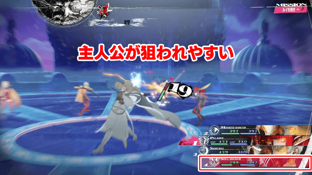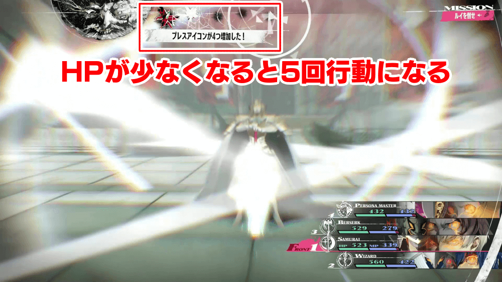 ルイはHPが少なくなると、毎ターン5回行動になる。5回行動で弱点を突かれ続けると非常に不利になるため、ある程度HPを減らしたら、行動パターンが変わる前に残りのHPを一気に削り切るのがおすすめ。