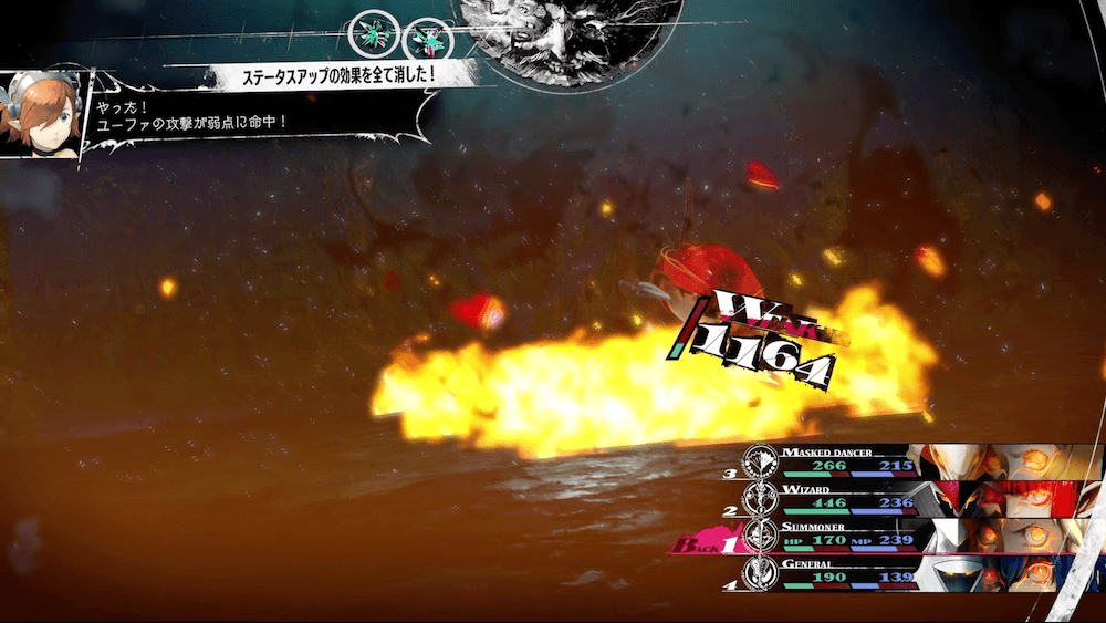 仲間:魔術師、仮面舞踏師、召喚士消費:MP22 行動消費:2回 敵全体に炎属性の魔法攻撃で超特大ダメージを与え、強化効果を打ち消す |