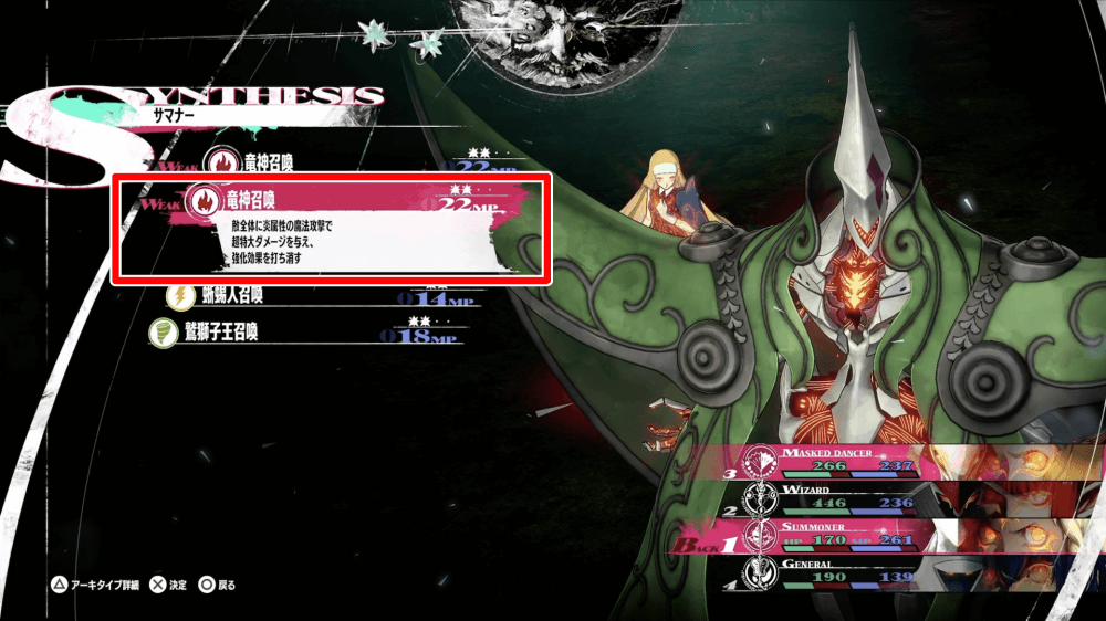 ・ジンテーゼ「竜神召喚」で炎の超特大ダメージ攻撃が可能 ・依り代・石翼作成で炎属性弱点を突ける |