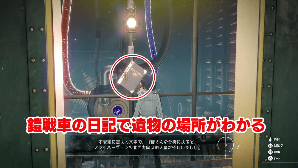 鎧戦車中央通路にかけられている「日記」を調べると、遺物がある場所のヒントを確認できる。日記を読むのは必須では無いが、どこに遺物があるか確認したい時に利用しよう。