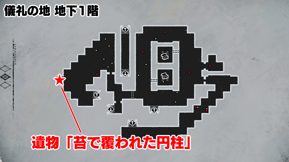 マップ 外観 儀礼の地を進み、道中の宝箱からニューラスが探す遺物「苔で覆われた円柱」を入手しよう。遺物は、儀礼の地地下1階の西側にある宝箱から入手できる。