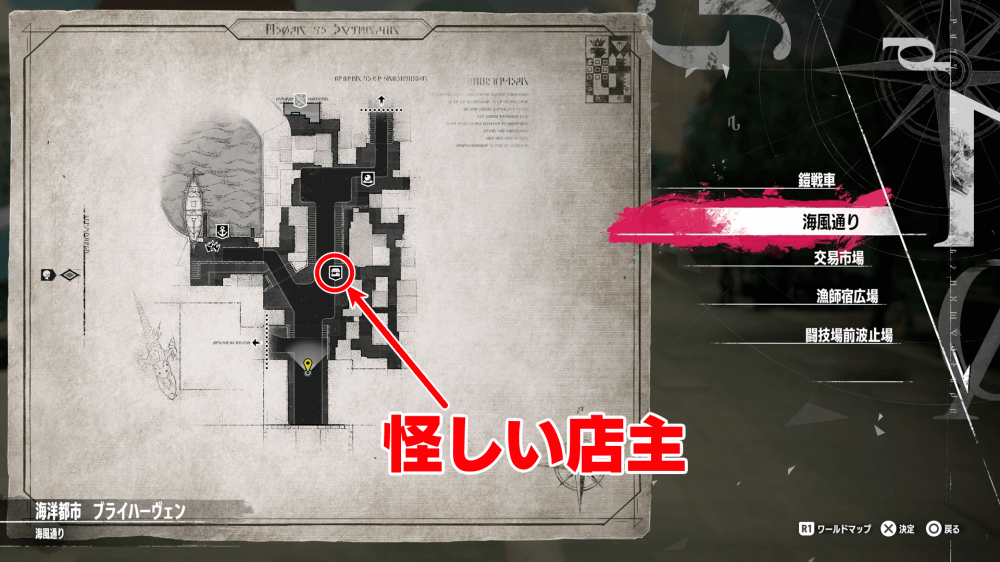 怪しい店主は、ブライハーヴェンの海風通りの露店で販売している。曜日ごとに日替わりで白面や食材を販売しているため、欲しい商品がある曜日は忘れずに購入しに行こう。