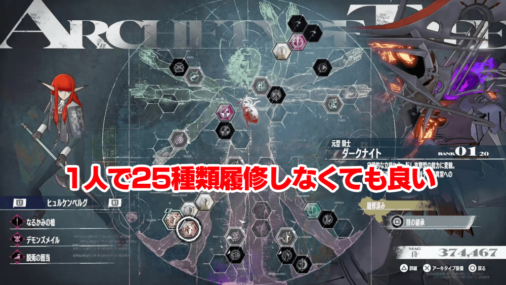 25種類のアーキタイプは、1人のキャラで履修する必要はなく、パーティ全員の合計が25種類になれば良い。サムライやダークナイトなど、最上位のアーキタイプの履修は、前提となるアーキタイプを既に育てているキャラに任せると効率的に履修が進む。