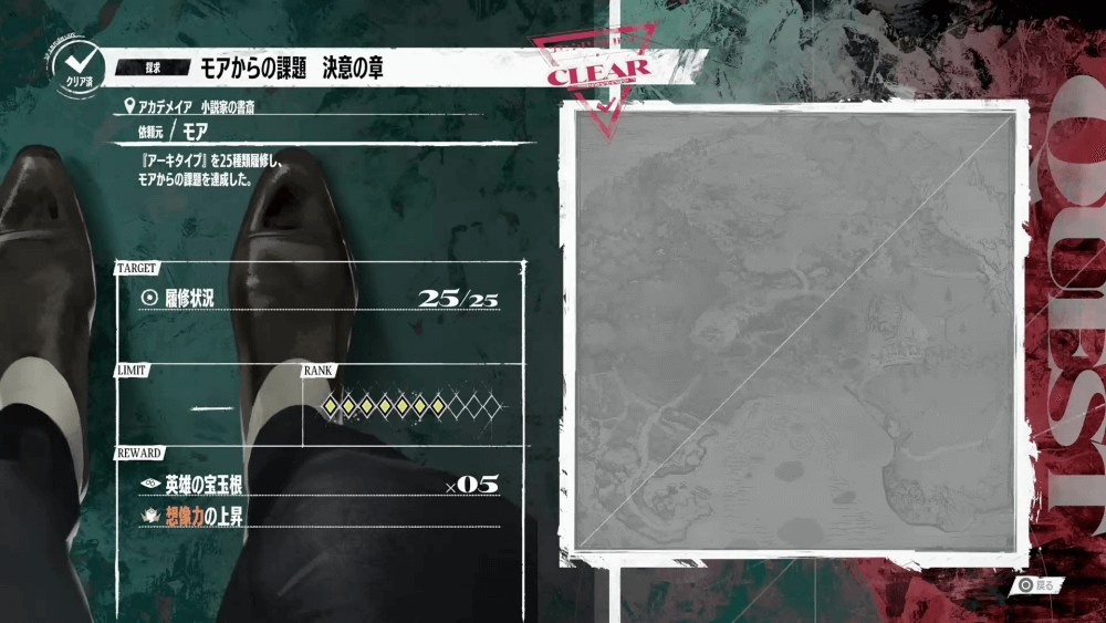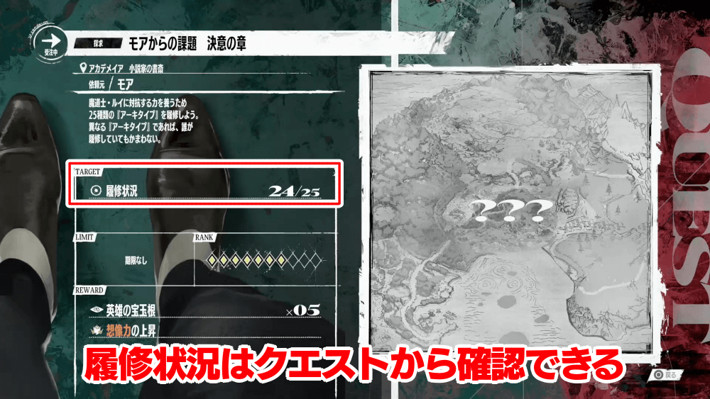 アーキタイプを25種以上履修したら、アカデメイアに行ってモアに報告しよう。報酬が受け取れるほか、次の依頼「モアからの課題 最終章」を受注できる。