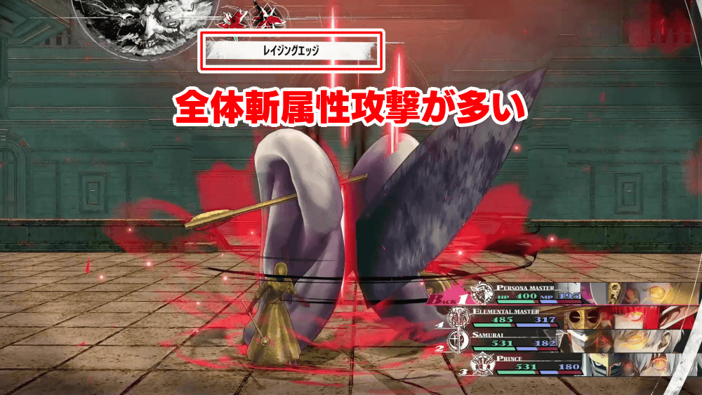 漆黒のホモ・オレロンは、レイジングエッジで全体に斬属性攻撃を頻繁に仕掛けてくる。弱点を突かれないように、斬属性が弱点になる「砲手」を編成するのは避けよう。