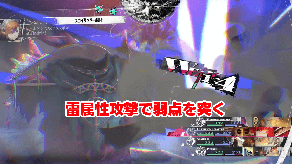 漆黒のホモ・オレロンは雷属性が弱点であるため、雷属性の攻撃でプレスアイコンの消費を抑えつつダメージを与えよう。特にエレメンタルマスターの「スカイサンダーボルト」は、雷属性の超特大ダメージを与えられるので、積極的に使っていこう。