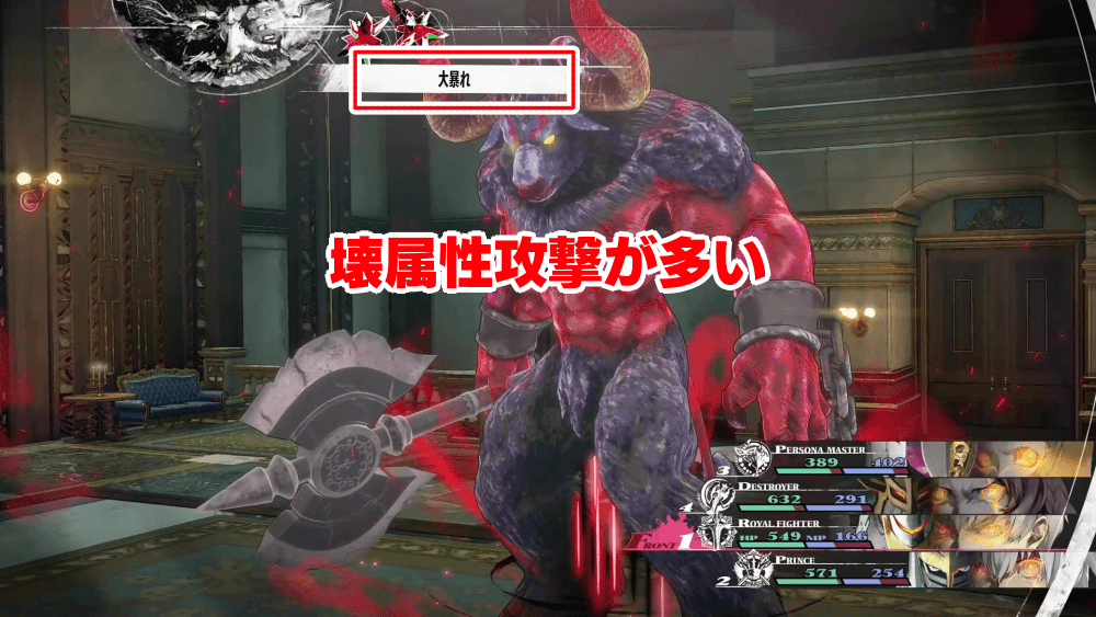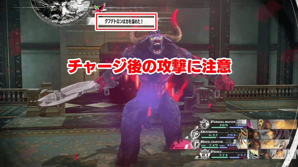グプデトロンは、チャージで物理攻撃の威力を大幅に上昇させ、大暴れで全体に大ダメージを狙ってくる。壊属性が弱点でなくても壊滅する恐れがあるので、チャージされた次のターンは後列に下がって防御しよう。