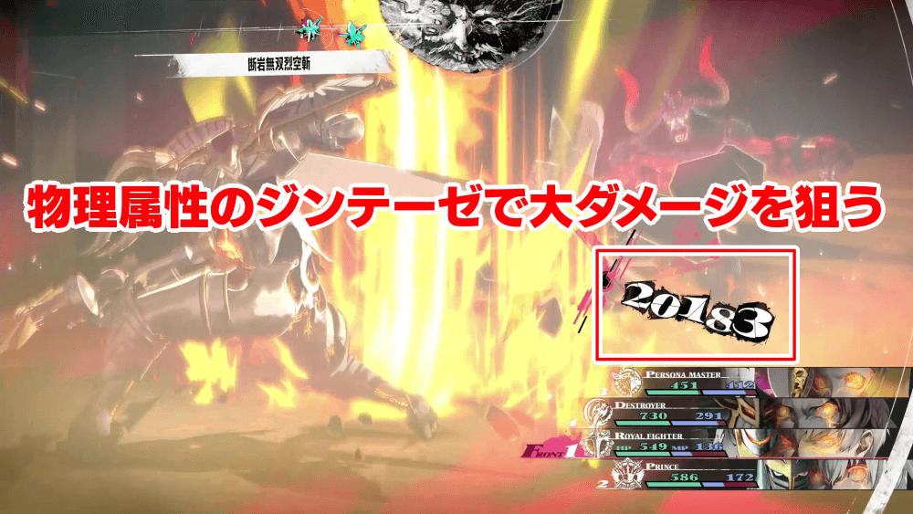 グプデトロンは物理属性に耐性が無いので、マスカレイドチャージと物理属性のジンテーゼで一気に大ダメージを狙える。弱点を狙える「暴走穿ち」や、ファイターの「残岩無双烈空斬」で、一気にHPを削り切ろう。