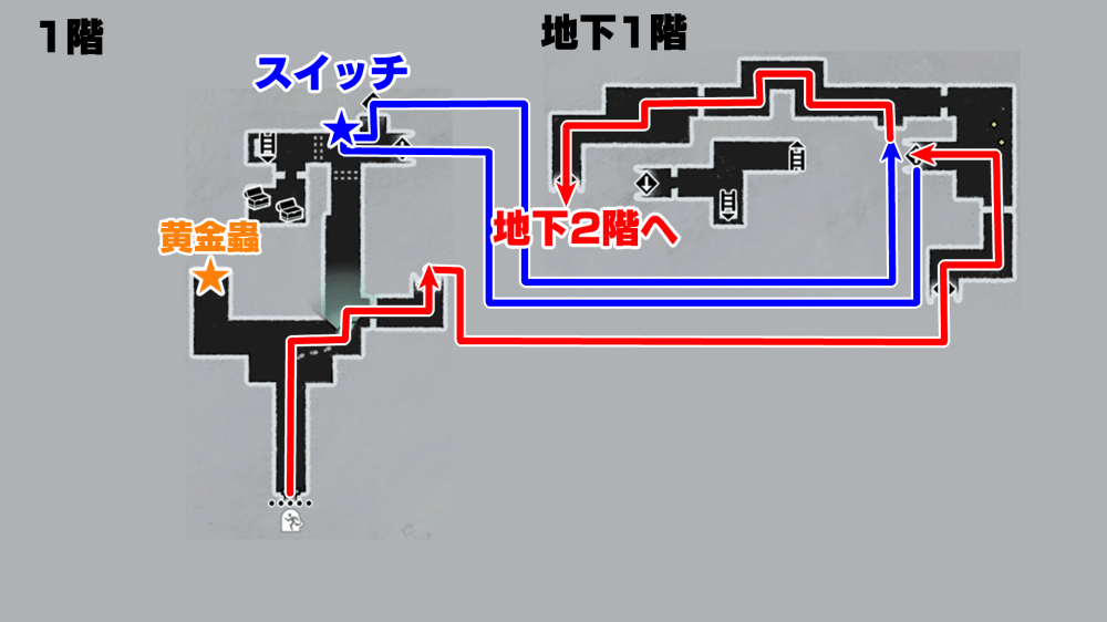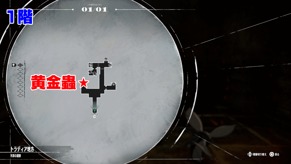 マップ 外観 不詳の遺跡1階では黄金蟲を1匹拾えるため、忘れずに回収しておこう。黄金蟲は、1階の西側で回収できる。