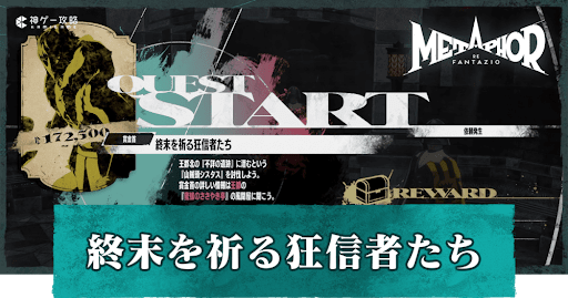 メタファーリファンタジオの依頼「終末を祈る狂信者たち」の攻略情報を掲載。受注場所や発生タイミング、報酬やボス「ホモ・サンドロ」の倒し方などについて掲載しているので、メタファーをプレイする際の参考にどうぞ。