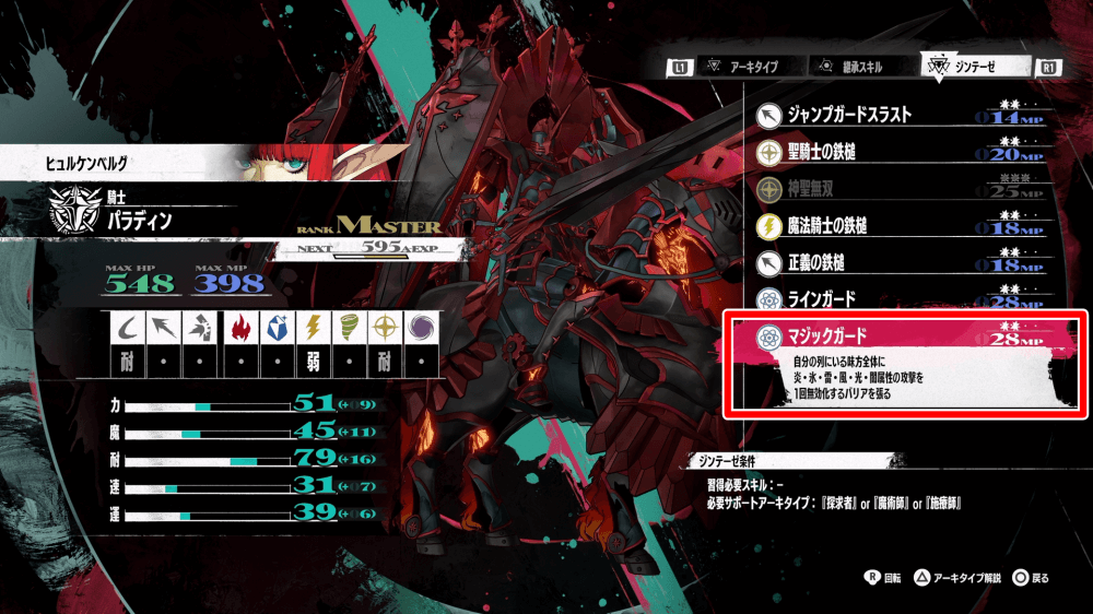 パラディンのジンテーゼ「マジックガード」で、ホモ・サンドロの魔法攻撃を無効化しよう。魔法攻撃の無効化でホモ・サンドロの行動も減らせるため、被ダメージを抑えながら戦える。