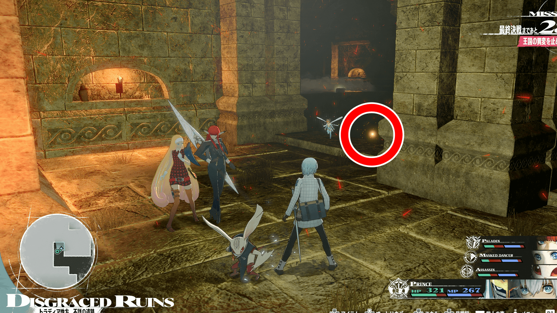 番号 入手アイテム 1(敵) 黒のモノクル2 純白の足袋地下2階の脇道を通り、ダンジョン1階まで進み宝箱を開封しておこう。マップから見て右側にある宝箱を開封すると、死宝イミテゾロとの戦闘になるため、宝箱を開封する前に回復を済ませておくのが良い。