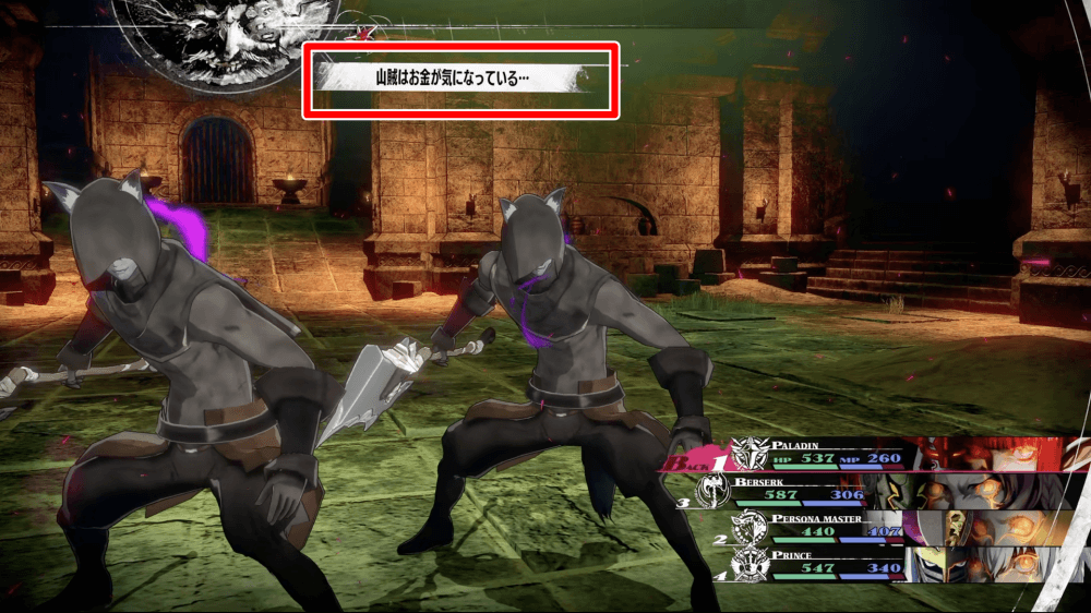 山賊頭シスタス戦では、ゴールドラッシュやゴールドアタックを使い山賊たちの気を逸らそう。ゴールドラッシュやゴールドアタックを使用すると、「お金が気になっている…」と表示され敵の行動が止まる。