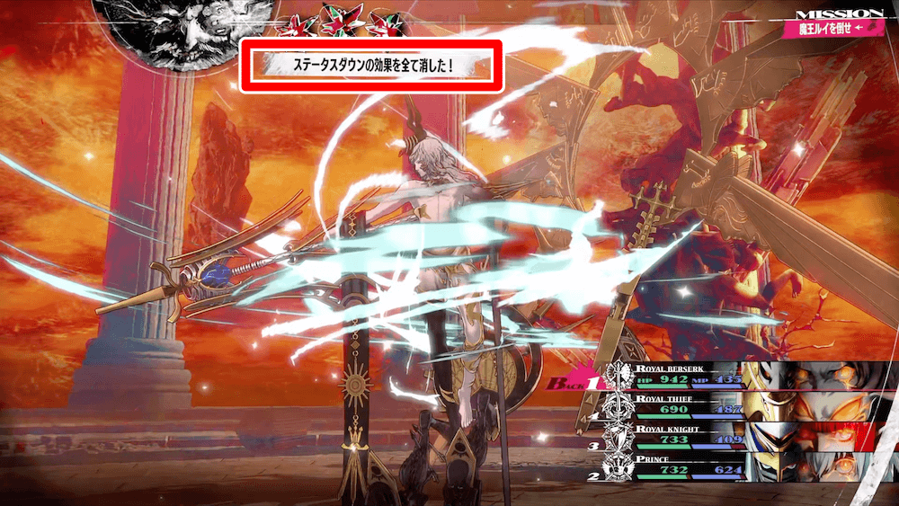 魔王ルイのチャージ「収束する不安」は、ロイヤルベルセルクの1万以上のダメージなど一定以上のダメージを与えてすぐに解除しよう。解除できなかった場合は、次ターンに強力な全体攻撃が発動する。