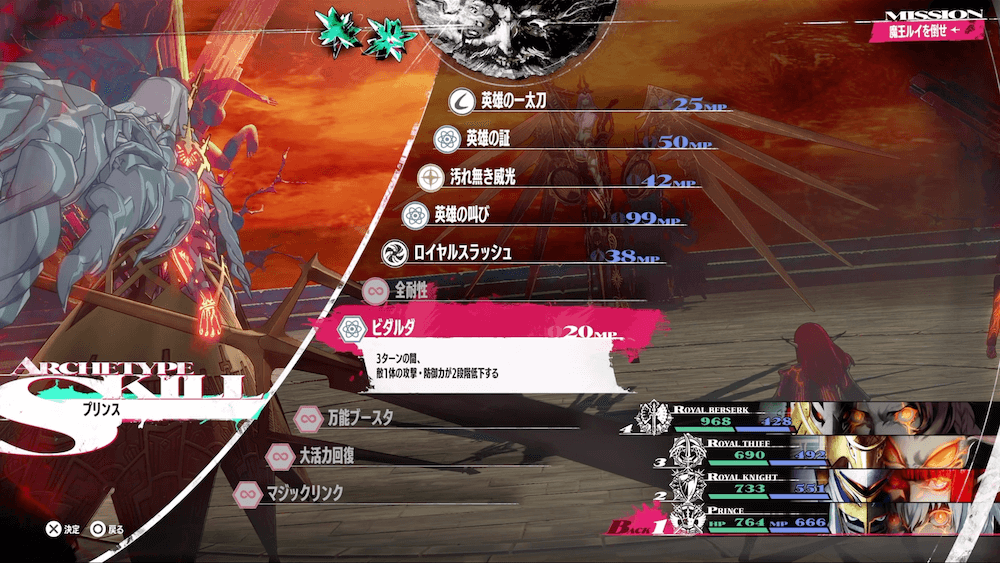 魔王ルイには、バジリオを中心に物理攻撃でダメージを与えよう。主人公に副防具「至尊の王冠」装備でプレス増加した状態かつバジリオにアクセサリ「影分身のヒトガタ」を装備させておくと、味方が全員行動しつつチャージ+狂気の破壊で弱点付与しながら特大ダメージを与えられる。