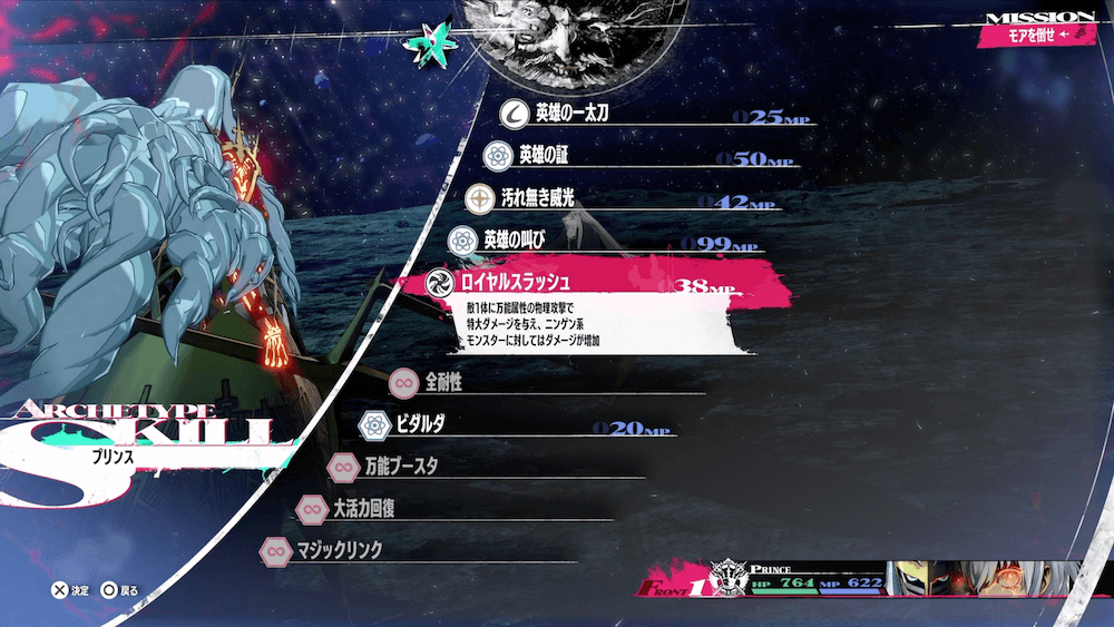 モア戦は、魔王ルイ戦で装備したアーキタイプで戦う必要がある。モアは弱点がないがHPも高くないため、装備しているアーキタイプの中の一番強力なスキルで攻めるのがおすすめだ。