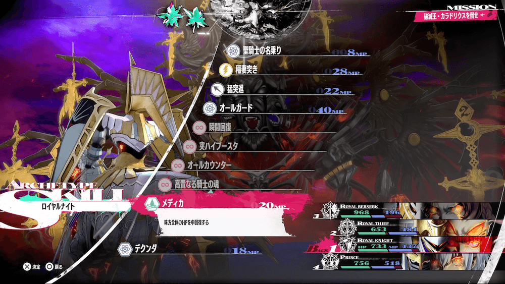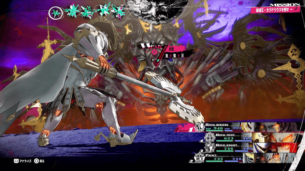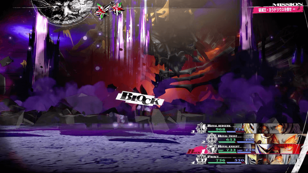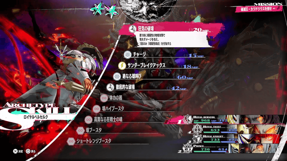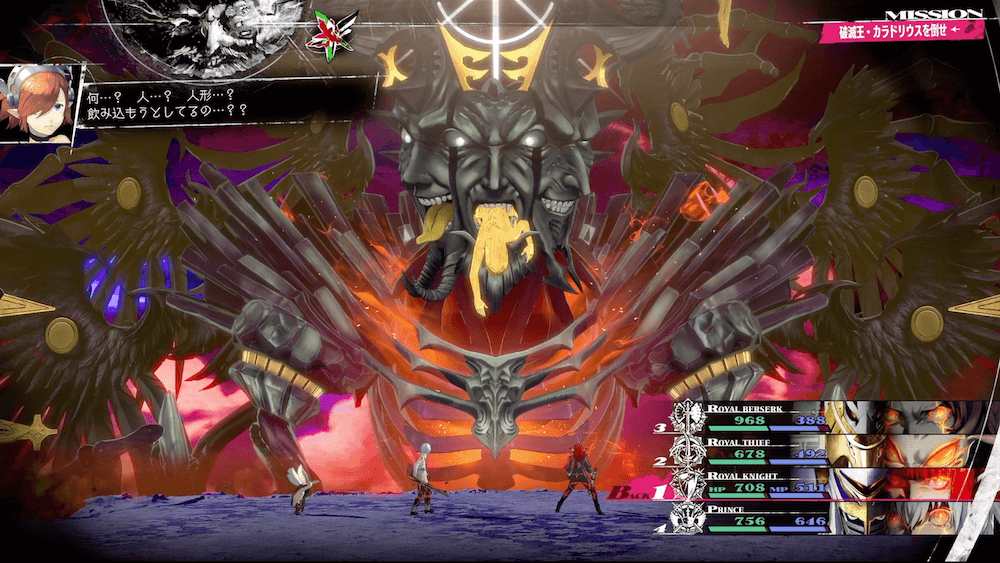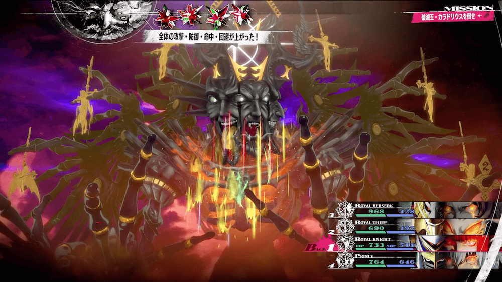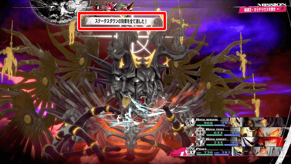ラスボスの面が残り1つになったら味方が敵に与えるダメージが大幅減少してしまうため、ロイヤルベルセルクの耐性無視の高火力攻撃で一気に畳み掛けよう。また、全ての面を破壊すると味方のHPやMPは引き継いだまま第2形態へ移行するため、とどめを刺す前にある程度回復しておくと良い。