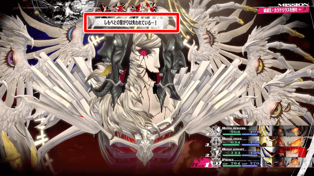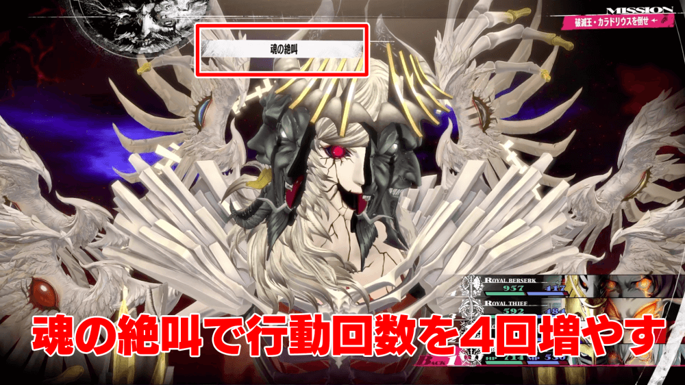 ラスボスの体力が残り少なくなったら、プリンスの英雄の叫びで味方のプレスを増やして一気に畳み掛けよう。ラスボスの残り体力が少なくなると、魂の絶叫で行動回数を4回増加させる。タイミングによっては最大8回行動してくるため、戦闘を長引かせないよう一気に敵のHPを削り切ろう。