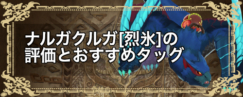 ナルガクルガ[烈氷]は、氷属性耐性が50%あり、高確率で毒を付与するタッグ技の「ポイズンスティンガー」を持っているため、龍天災クシャルダオラに高い適正がある。毒の確率を上げるため、特性「毒促進」を持つ「イリア」とタッグを組むと勝率が上がる。