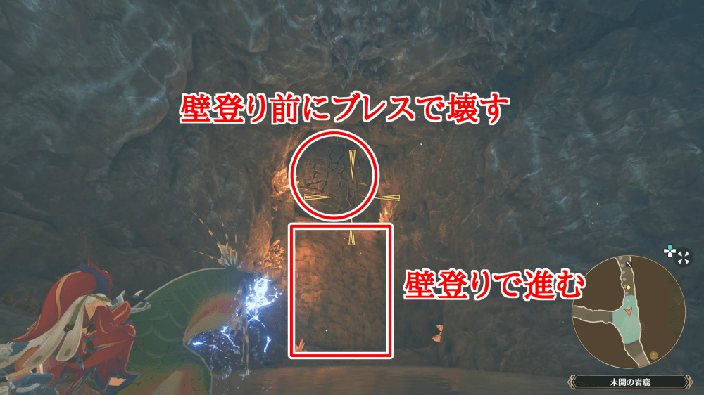 未開の岩窟に入ったら、ライドアクションを使って最奥まで進もう。ヒビの入った岩は近接攻撃やブレスで破壊し、壁登りを使って通路を進んでいくと良い。一部の壁登りポイントは壊せる岩で塞がれているため、先にブレスで破壊してから登ろう。