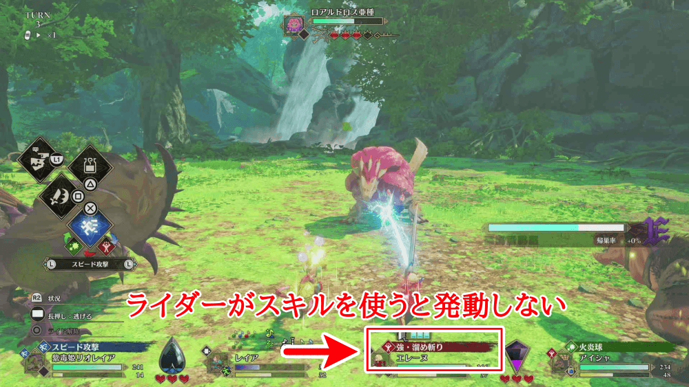 ダブルアクションが発生すると、通常の真っ向勝負よりも大きなダメージを与えられる。効率よくダメージを与えられるだけでなく、ライダーは通常攻撃を選択するため、スタミナを節約できるのもメリットだ。
