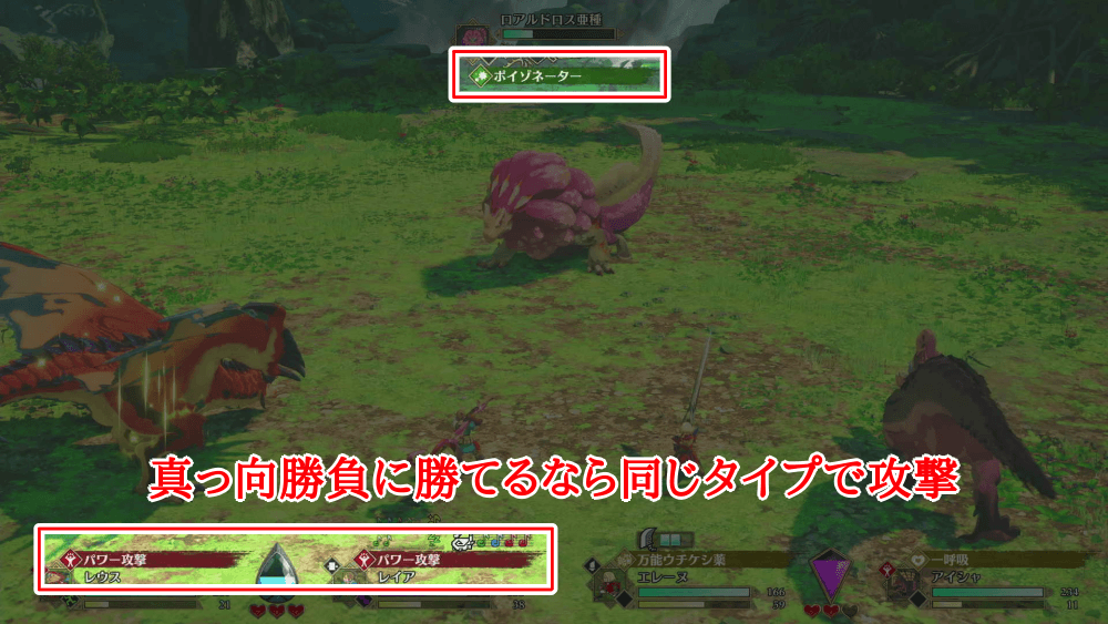 バトルラインが自分に向いている場合は、勝てる3すくみタイプの通常攻撃を選択し、自分のオトモンとタイプを合わせて同じ敵を攻撃しよう。自分のオトモンに向いている場合も同様に、3すくみで勝てるタイプに入れ替えてから攻撃を合わせれば良い。