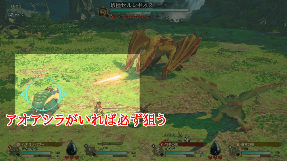 【怒り時】 テクニックアオアシラで珍種セルレギオスをおびき出したら、アオアシラをメインにして倒そう。セルレギオスはアオアシラがいれば必ず狙ってくるため、3ターン目から5ターン目の怒りターン中は、毎回ダブルアクションで攻撃を阻止できる。