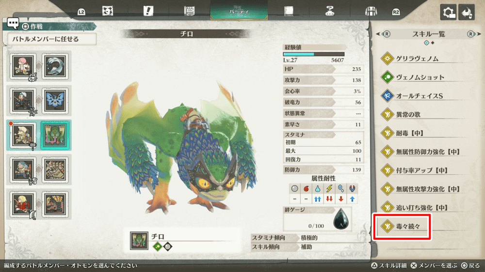 オオパのオトモンであるチロが「毒々続々」を覚え、付与する毒のターンが4ターン延長される。チロはゲリラヴェノムやヴェノムショットで毒を付与し、オールチェイスSで大ダメージを与えるスキル構成であるため、オールチェイスSを使えるターン数が増える優秀なスキルだ。