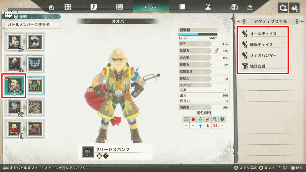 オオパの推理をクリアすると、オオパの武器にハンマーが追加される。バトルメンバーの武器は、バトルメンバー変更からR3スティック押し込みで変更可能だ。