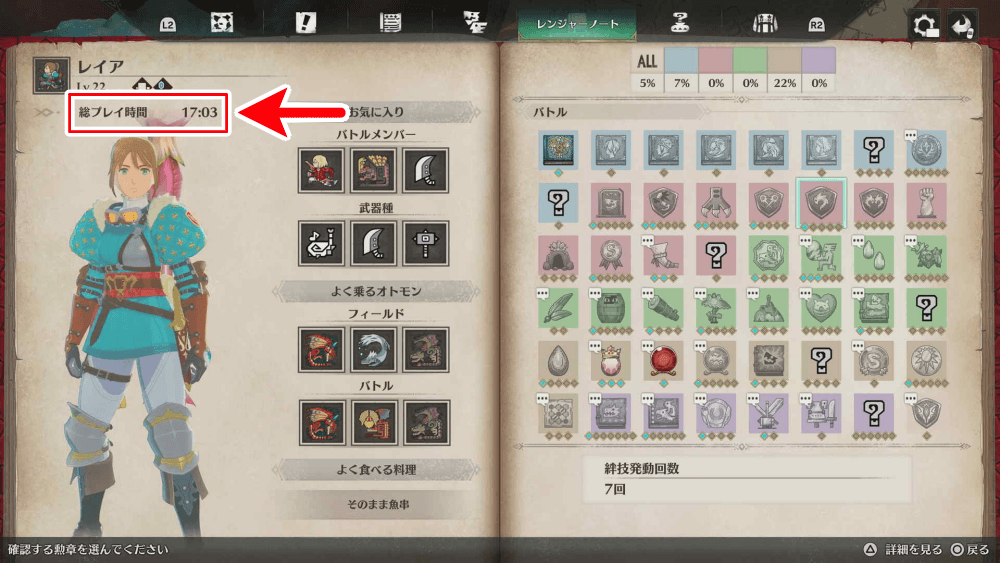 プレイ時間は、レンジャーノートの活動記録で確認が可能だ。レンジャーノートはメニューから開けるが、戦闘中は確認できないため、総プレイ時間を知りたい時は戦闘を終わらせよう。