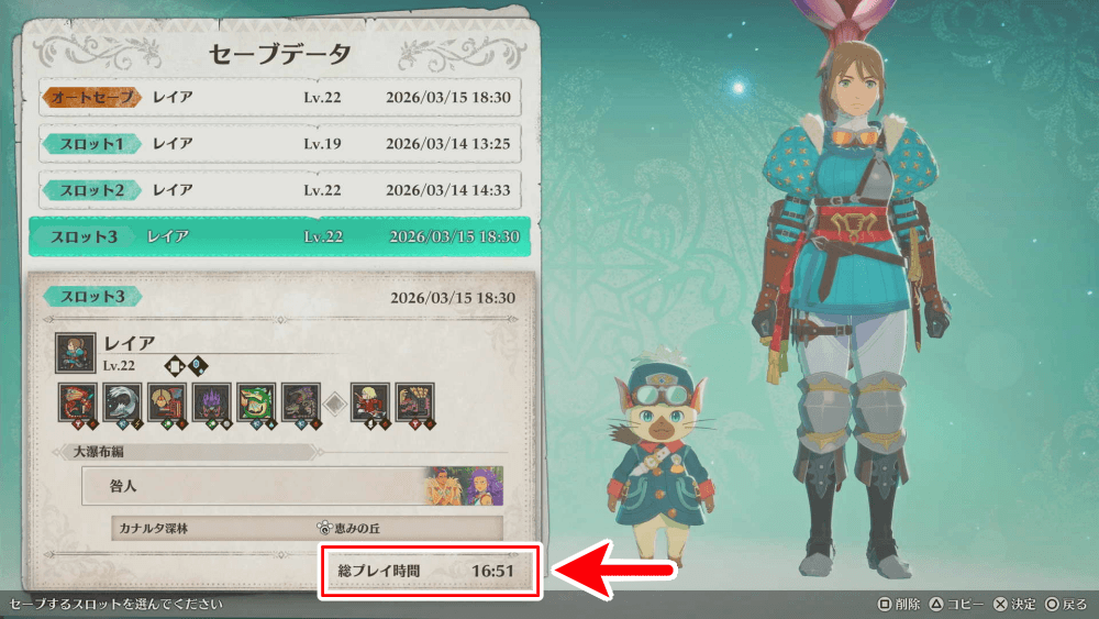 総プレイ時間は、ネコタクスタンドでセーブをする際にも確認できる。セーブした時点での総プレイ時間が記録されるため、セーブデータを分けておけば進行度ごとのプレイ時間を確認可能だ。